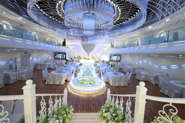 皇宮廳—金碧輝煌、皇宮式裝修,面積1038㎡,層高8.6米,配備愛情階梯、軌道威亞、二層觀禮臺、浪漫燈光秀、旋轉升降舞臺、頭頂天幕連接開合大屏??沙薪?0桌的大型宴會,也可舉辦600人的大型會議;還可用作會展、車展場地,每逢節假日還為市民上演文藝節目。